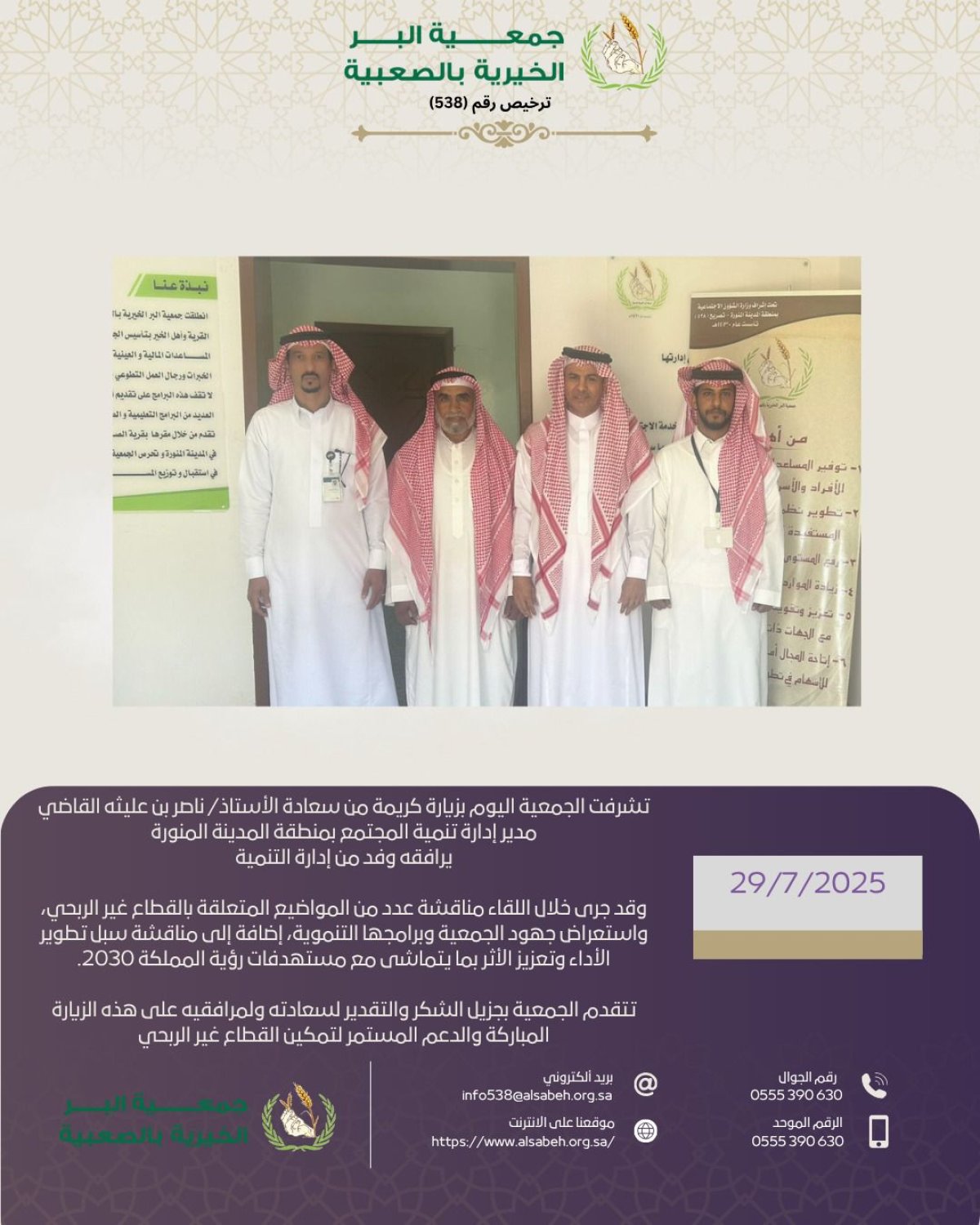 تشرفت الجمعية اليوم بزيارة كريمة من سعادة الأستاذ/ ناصر بن عليثه القاضي مدير إدارة تنمية المجتمع بمنطقة المدينة المنورة ويرافقه وفد من إدارة التنمية تتقدم الجمعية بجزيل الشكر والتقدير لسعادته ولمرافقيه على هذه الزيارة المباركة والدعم المستمر لتمكين القطاع الغير ربحي